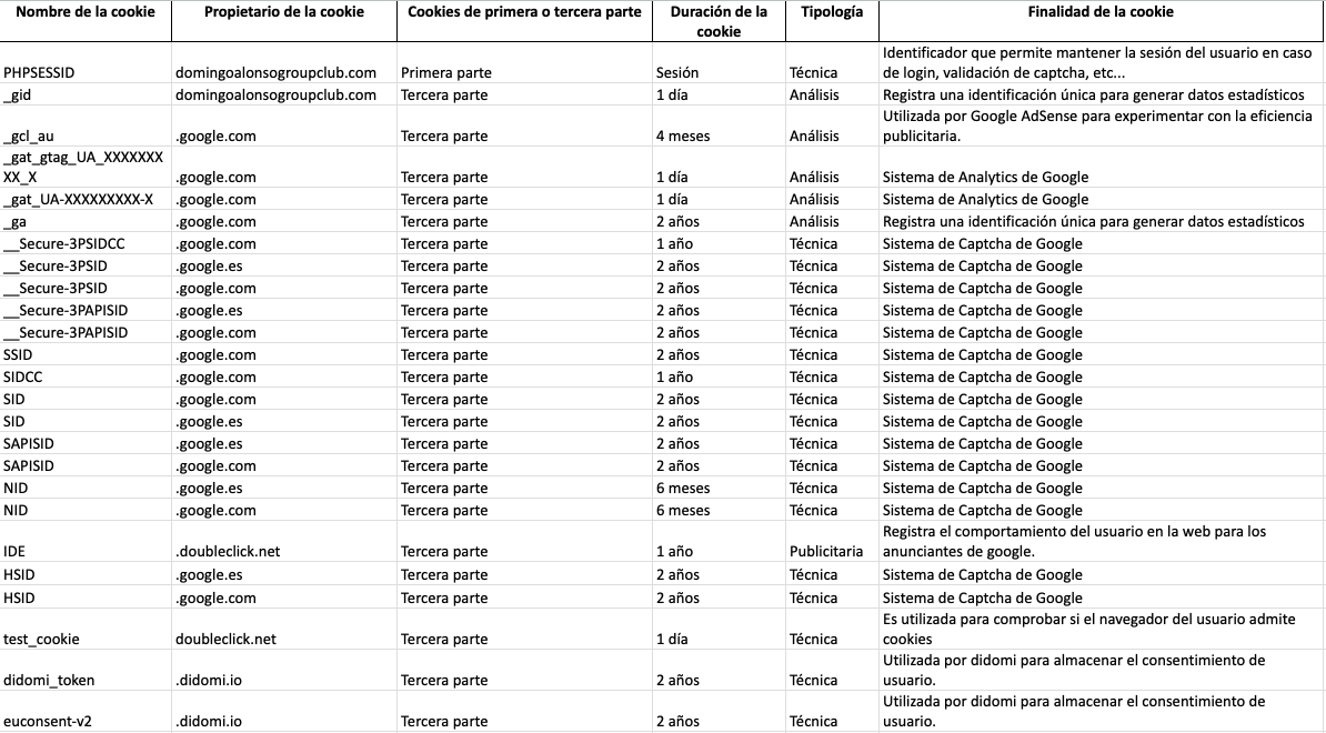 La siguiente es una relación de las cookies usadas en esta página web. Esta lista no tiene carácter limitativo y dado que se actualiza cada 6 meses en el momento de acceder a esta web puede estar desactualizada. La lista concreta de cookies activas en cada momento la podrá encontrar en el apartado de configuración de preferencias de la herramienta que hemos dispuesto al efecto en la web, DIDOMI. Puede acceder a ella en cualquier momento a través del enlace que se encuentra en el pie de página de la web, con el texto "Seleccionar consentimientos":